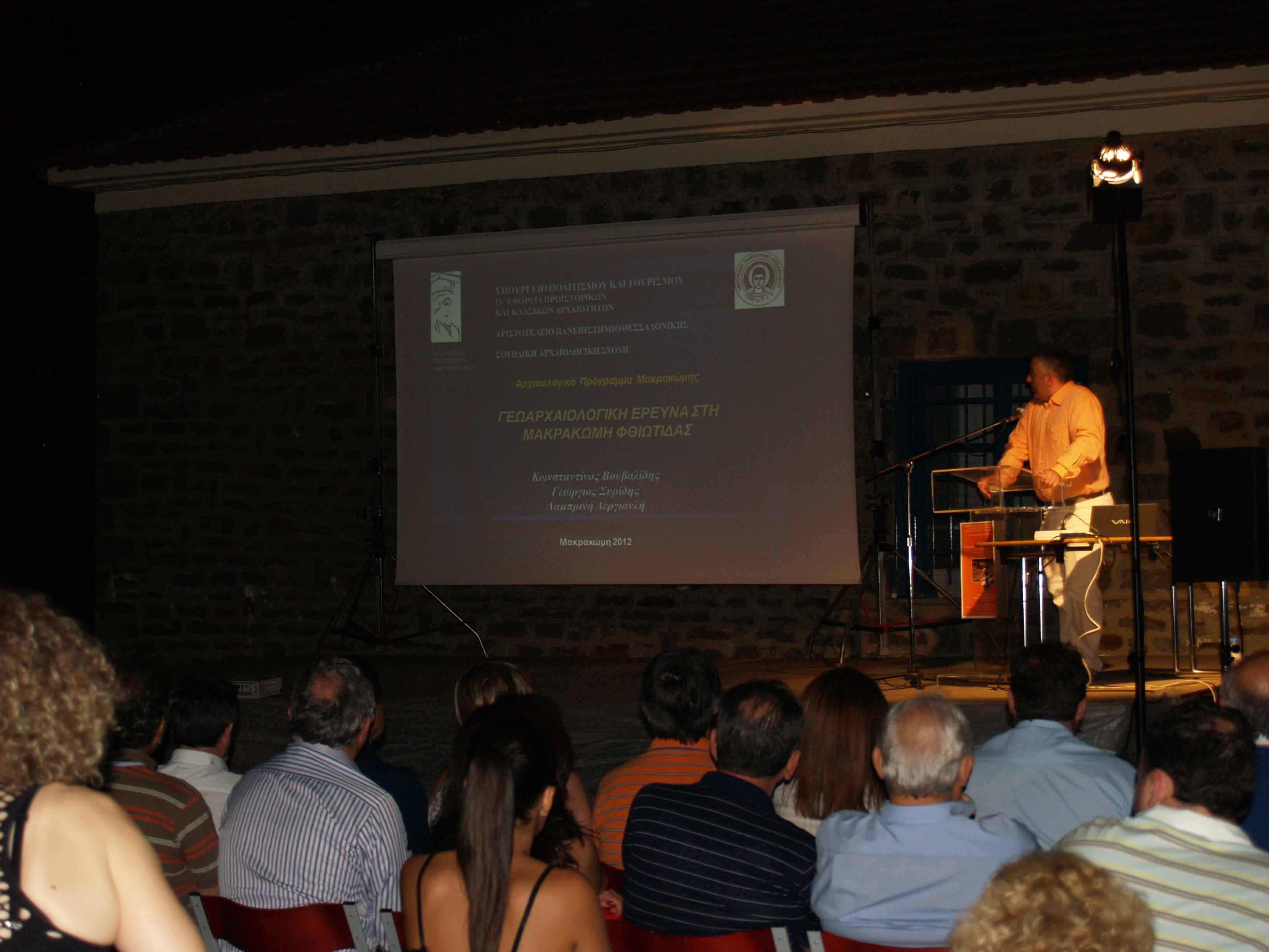 Στο προαύλιο του Δημοτικού Σχολείου Μακρακώμης συγκεντρώθηκαν στις 8:30 μ.μ. περί τα 250 άτομα, κάτοικοι της περιοχής και των γύρω χωριών και όχι μόνο, προκειμένου να παρακολουθήσουν τις ομιλίες σχετικά με την εξέλιξη των ερευνών το 2012. Προηγήθηκαν χαιρετισμοί του Δημάρχου κ. Ευθυμίου Παπαευθυμίου, της Βουλευτή Φθιώτιδας κ. Ελένης Μακρή-Θεοδώρου, του Αντιπεριφερειάρχη Στερεάς Ελλάδας κ. Νικολάου Μπέτσιου καθώς και του Προέδρου του Εκπολιτιστικού και Μορφωτικού Συλλόγου των Απανταχού Μακρακωμιτών κ. Νικολάου Ράπτη.